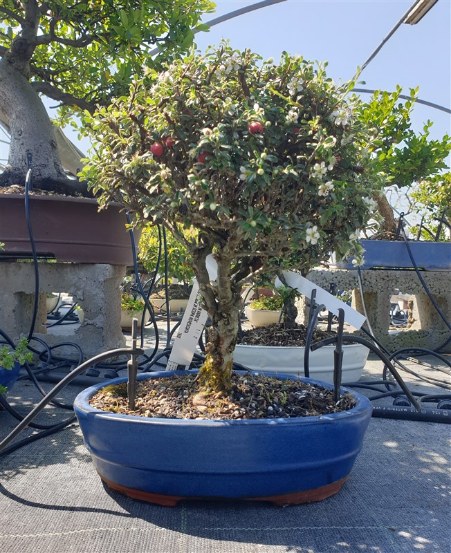 "Il Cotoneaster spp. è un bonsai sempreverde o semi-sempreverde che incanta in ogni stagione. Questa pianta è particolarmente apprezzata per i suoi piccoli rami sinuosi, le foglie ovali e lucide di un verde intenso, e per la sua fioritura primaverile che si manifesta in graziosi fiorellini bianchi. Ma il vero fascino del Cotoneaster arriva in autunno, quando si arricchisce di bacche rosse che persistono per tutto l’inverno, creando un effetto decorativo unico.